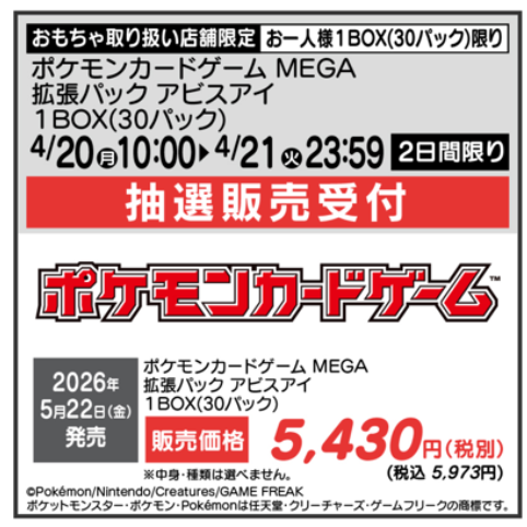【ポケカ新弾】アビスアイの抽選・予約はいつから?販売店の応募方法・抽選スケジュール・発売日まとめ2026年5月22日(金)発売の、ポケモンカードゲーム MEGA拡張パック『アビスアイ』。 「アビス(深淵)」というミステリアスな...