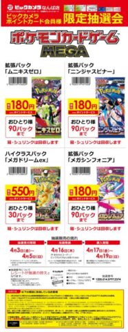 | 4月12日(日) | ※一部店舗 ※売り切れている場合もあります。 【店頭販売】 ■ジョーシン ※シルバースマイル会員以上 ※お1人様5パック ■ヨドバシカメラ ・新潟駅前 ・札幌(整理券配布終了) ・京都(完売) ※ゴールドポイントカードプラスお持ちの方 ・町田 ※ゴールドポイントカードプラスお持ちの方 ※2月以降に購入履歴のない方 ■ビックカメラ ・柏 ※ビックカメラクレジットカード会員限定 ・池袋本店(東口) ※ビックカメラクレジットカード会員限定 ※3月以降に購入履歴のない方 ■カードボックス ・高槻店 ※15時~開催のポケカジムバトル参加者に、メガドリの抽選販売 ※詳しくは店舗Xから ■文真堂トレカ丸 ・足利助戸店 ※高校生以下(乳幼児除く)限定 ■晴れる屋2 ・秋葉原アネックス店 ※中学生以下のお客様限定 【抽選販売】 ■ふるいち ・イオンモール筑紫野 ※抽選販売が決定! ※受付期間はわかり次第追記でご案内! (対象商品など詳しくは下記から) |