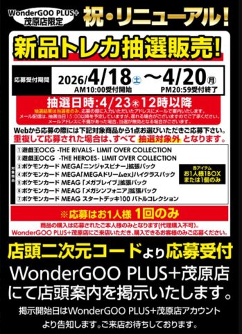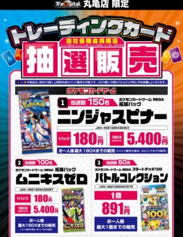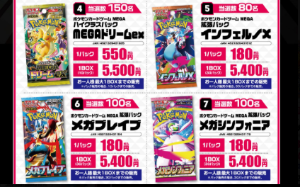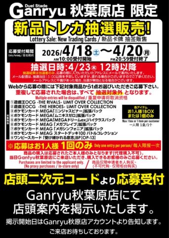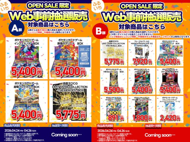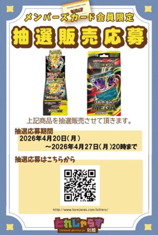 | 4月18日(土) | ※一部店舗 ※売り切れている場合もあります。 【店頭販売】 ■ジョーシン ※シルバースマイル会員以上 ※お1人様5パック ■TSUTAYA ・仙台南店 ※お1人様5パック ■晴れる屋2 ・池袋店 ※中学生以下のお客様限定 ■三洋堂トレカ館 ・近江八幡店 ※お1人様3パック ■シーガル ・イオンモール石巻店 ※お1人様2パック ■Japan TCG center ・千葉駅前店 ※ポイントカード必須 ※お1人様5パック 【抽選販売】 ■楽天ブックス ※複数応募しても、当選の場合はいずれか一商品のみ ・スタートデッキ100バトルコレクション5個セット ・ニンジャスピナー ・ムニキスゼロ ・インフェルノX ・メガブレイブ ・メガシンフォニア ・ブラックボルト ・ホワイトフレア ・ロケット団の栄光 ・熱風のアリーナ ・テラスタルフェスex ・バトルパートナーズ ・超電ブレイカー ・スペシャルカードセット メガエルレイドex ・スターターセットMEGA メガゲンガーex ・プレミアムトレーナーボックス MEGA ※ポケカ大量抽選開始! (詳しくは下記詳細から) ■Ganryu ・秋葉原店 NEW! ・茂原店 NEW! ※抽選開始! (詳しくは下記詳細から) ■ホビーステーション ※抽選開始 (詳しくは下記詳細から) ■TSUTAYA ・金沢店 ※抽選開始 (詳しくは下記詳細から) ■エディオン(トレカキャピタル) ・丸亀店 ※抽選開始! (詳しくは下記詳細から) ■イエローサブマリン ※抽選開始 (詳しくは下記詳細から) ■カードラボ ・秋葉原ラジオ会館本店 ・AKIHABARAゲーマーズB1店 ※抽選開始 (詳しくは下記詳細から) ■カードショップSMILY ※抽選開始 (詳しくは下記詳細から) ■ふるいち ・イオンモール熱田店 NEW! ・イオンモール筑紫野 ・イオンモール茨木 ※抽選開始! (対象商品や応募など詳しくは下記詳細から) ■カードボックス ・大垣店 ※抽選開始 (詳しくは下記詳細から) |