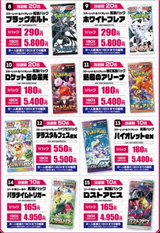 | 4月15日(日) | ※一部店舗 ※売り切れている場合もあります。 ※昨日の販売店でも継続販売している可能性もあり! 【店頭販売】 ■ジョーシン ※シルバースマイル会員以上 ※お1人様5パック ■イオン ■ヨドバシカメラ ・新宿西口 ※お1人様5パックまで ※ゴールドポイントカードプラスお持ちの方 ・上野 ※お1人様5BOXまで ※3月以降上野店で未購入の方 ※ゴールドポイントカードプラスお持ちの方 ■晴れる屋2 ・池袋店 ・秋葉原アネックス店 ※中学生以下のお客様限定 ■ブックオフ ・那覇小禄店 ※お1人様5パックまで ■シーガル ・イオンモール名取店 ※お1人様1パック 【抽選販売】 ■楽天ブックス ※4/17(金)10時~ポケカ大量抽選開始! (対象商品など詳しくは下記詳細から) ■ふるいち ・イオンモール筑紫野 ・イオンモール茨木 ※抽選開始! (対象商品や応募など詳しくは下記詳細から) ■カードボックス ・大垣店 NEW! ※抽選開始 (詳しくは下記詳細から) |