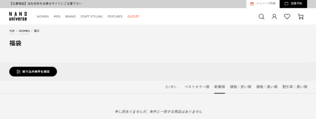 毎年11月20日前後で、公式オンラインサイトで予約が始まるナノユニバースの福袋ですが、オンラインサイトを調べてみてもこのような表示になっています。