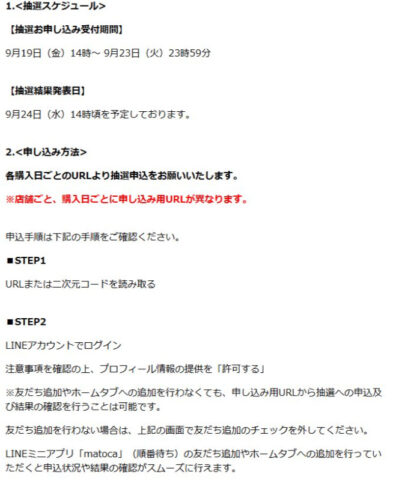 応募は購入したい店舗のスタッフボイスに記載されたURLからで、抽選に応募するにはLINEアカウントが必要になります。