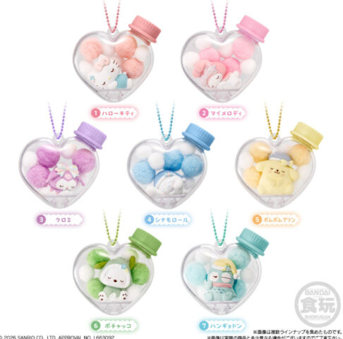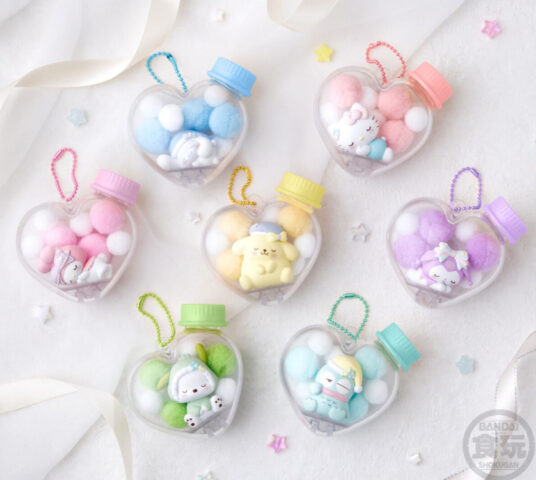 「キャラもふケースマスコット サンリオキャラクターズ」はハートの瓶型ケースに、寝ているサンリオキャラが入ったかわいいマスコットチャーム付きの食玩!