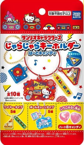 今回のアイテムは、歴代のサンリオキャラクターたちが賑やかに連なったアクリル製の「じゃらじゃらキーホルダー」と、可愛らしい「ハートキャンディ」のセットです。