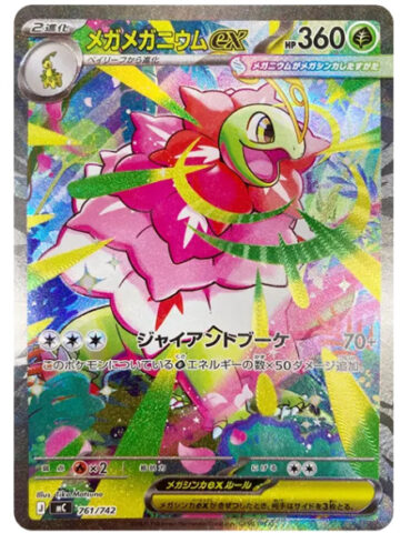 「メガメガニウムex」はSARとして収録され、シリーズ登場から根強い人気のあるメガニウムの新たな姿が描かれたカード。